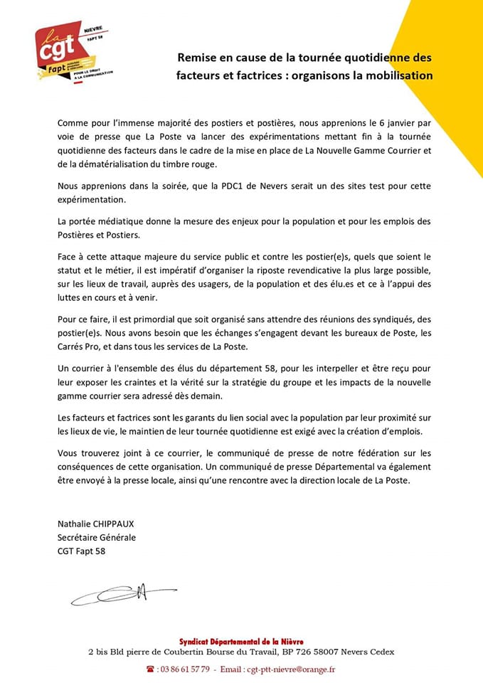 REMISE EN CAUSE DE LA TOURNÉE QUOTIDIENNE DES FACTEURS ET FACTRICES : ORGANISONS LA MOBILISATION !