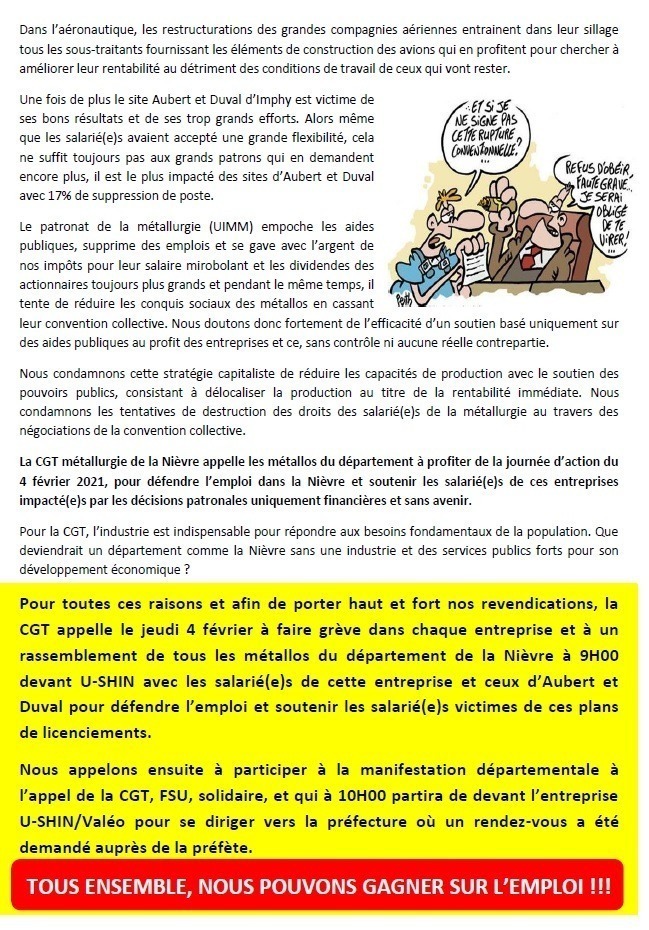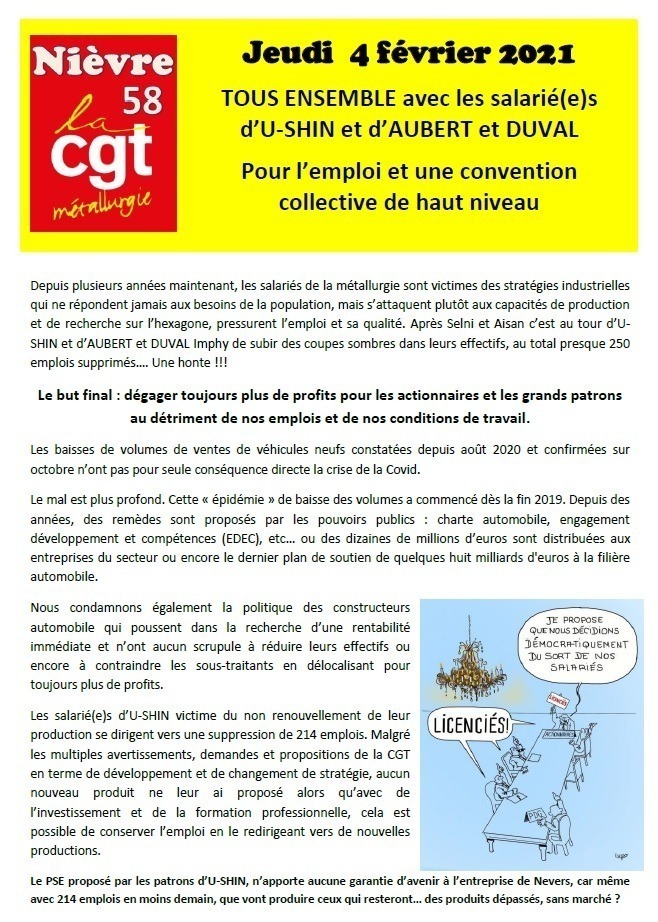 METALLURGIE : 4 FEVRIER 2021 TOUS ENSEMBLE AVEC LES SALARIE.E.S D’U-SHIN ET AUBERT ET DUVAL