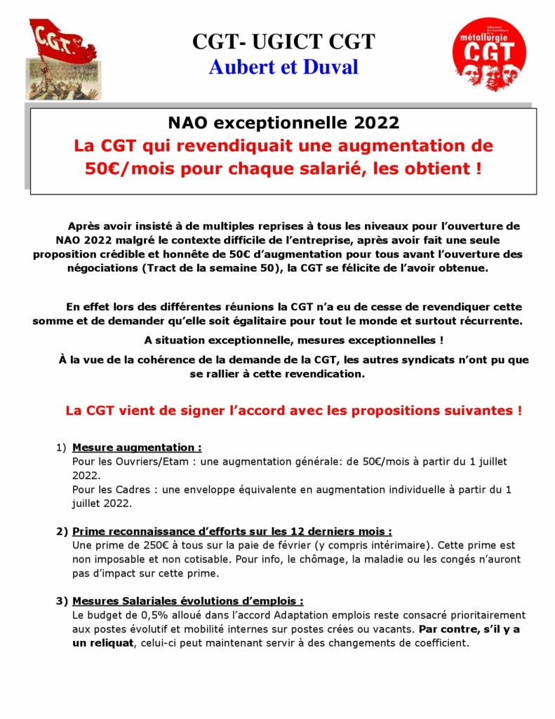 NAO AUBERT ET DUVAL – LA CGT QUI REVENDIQUAIT UNE AUGMENTATION DE 50€ PAR MOIS POUR CHAQUE SALARIE, LES OBTIENT!