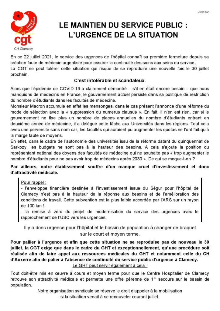 CH CLAMECY: LE MAINTIEN DU SERVICE PUBLIC : L’URGENCE DE LA SITUATION