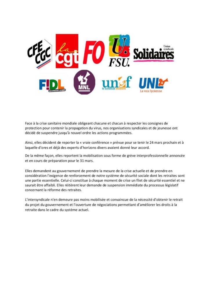 COMMUNIQUE INTERSYNDICAL DU 16 MARS 2020