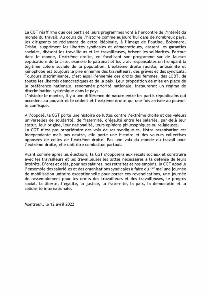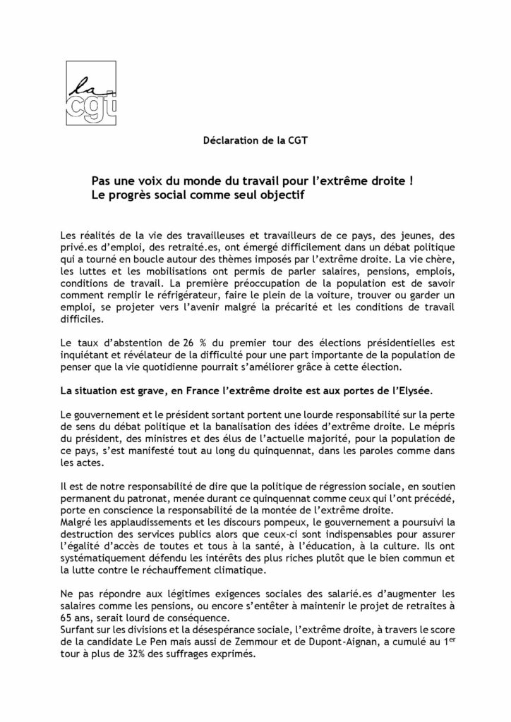 PAS UNE VOIX DU MONDE DU TRAVAIL POUR L’EXTRÊME DROITE ! LE PROGRÈS SOCIAL COMME SEUL OBJECTIF !